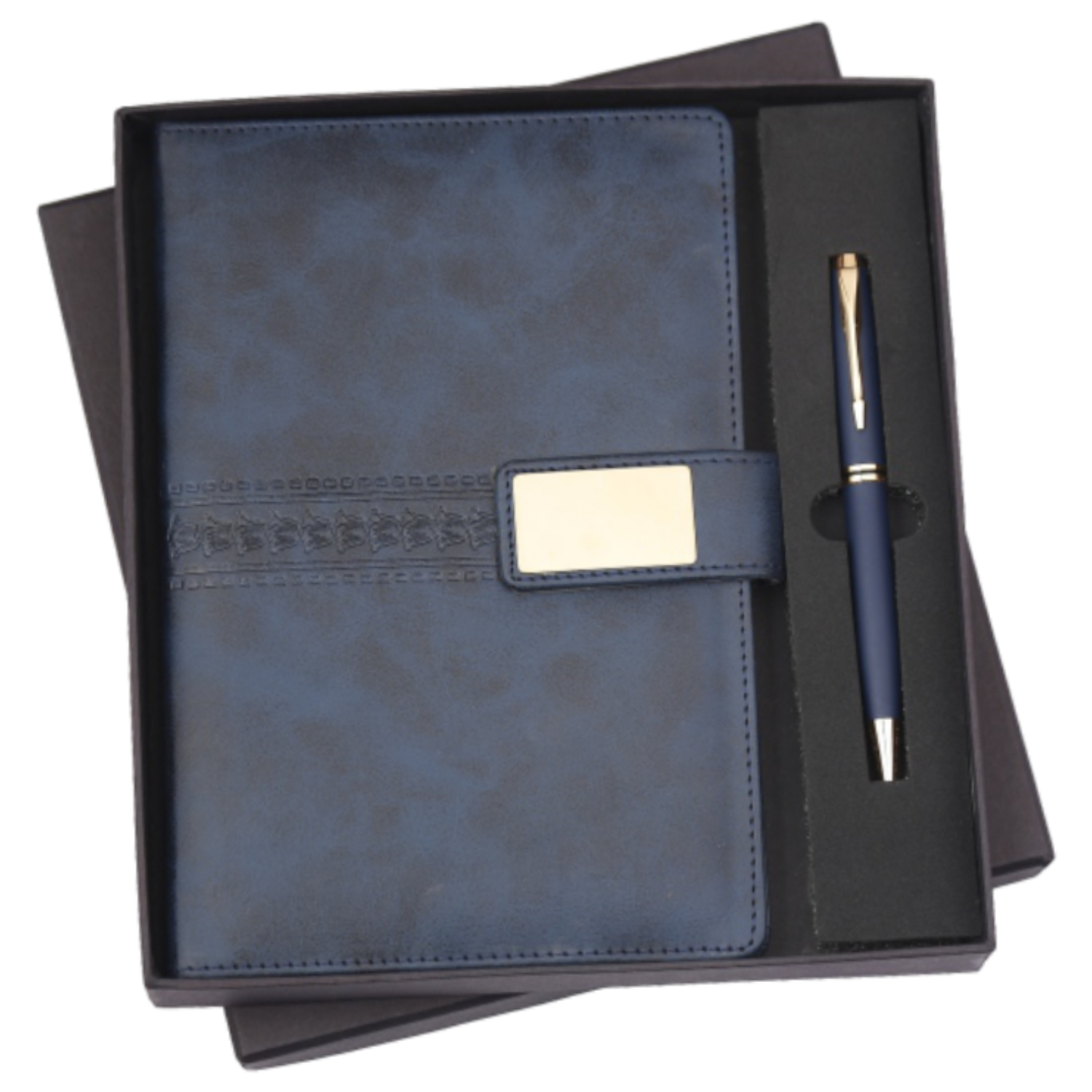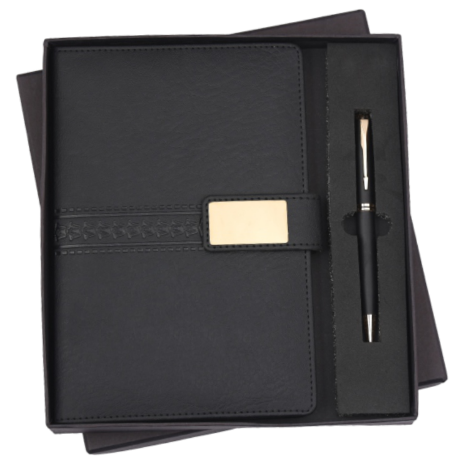 Sophistication meets functionality in this premium journal and pen set. Featuring a textured leather-like cover with a gold-accented clasp and a matching executive pen, this set is ideal for professionals who appreciate style and utility. A perfect gift for festive occasions, conferences, or client appreciation.