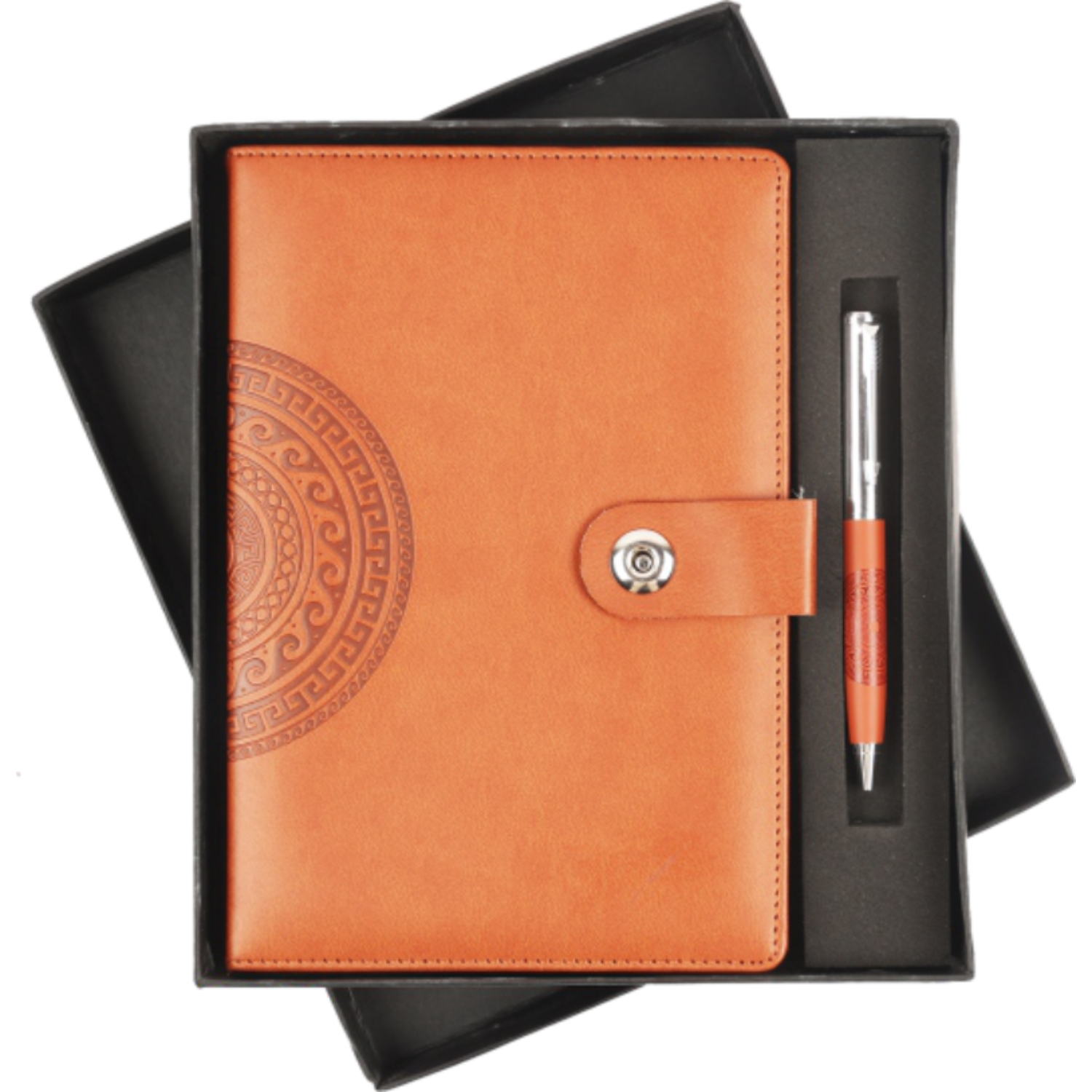 Celebrate heritage with elegance. This tan leatherette journal features an intricately embossed ethnic mandala design and a secure metallic clasp, paired with a matching pen for a cohesive and charming gifting solution. Ideal for festive gifting, employee welcome kits, or client appreciation.