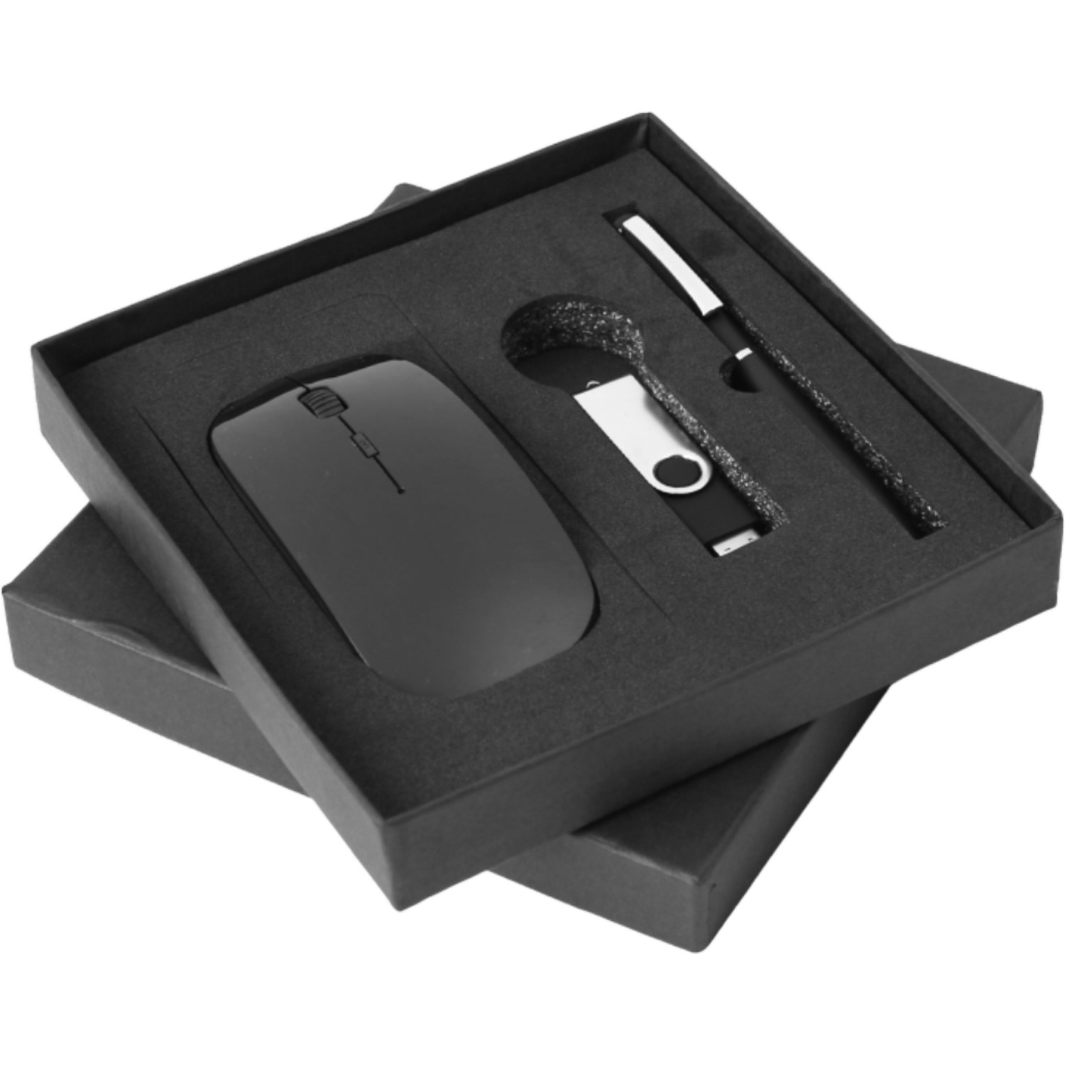 An ideal gift for tech-savvy professionals, this elegant executive set includes a sleek wireless mouse, a compact USB drive, and a premium black pen, all packed in a stylish gift box.