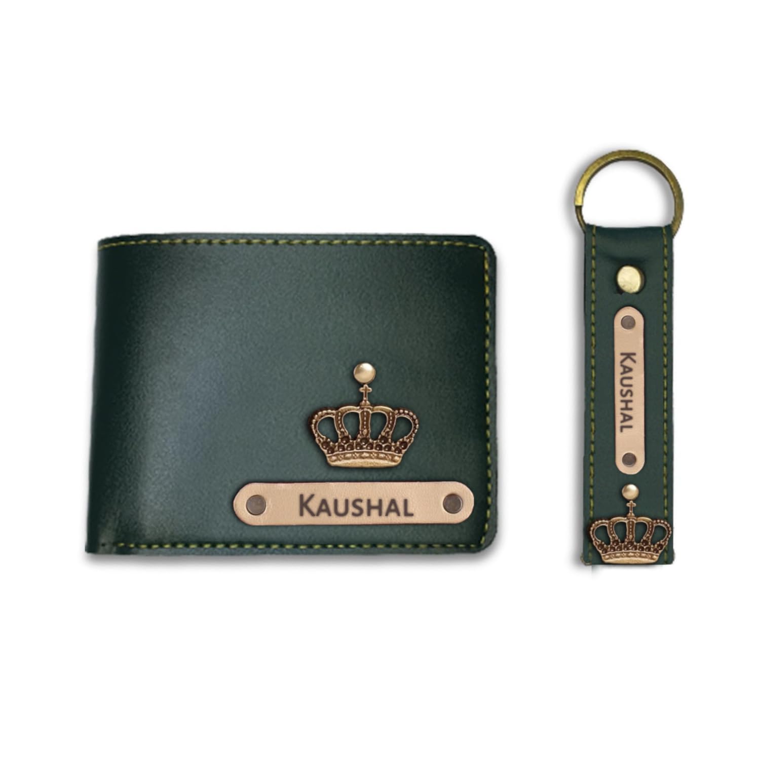 Make a lasting impression with this premium personalised men’s wallet and keychain combo, crafted from high-quality leather in a rich green shade. The elegant metal name plate and royal crown emblem add a luxurious and classy look, making this set truly stand out.