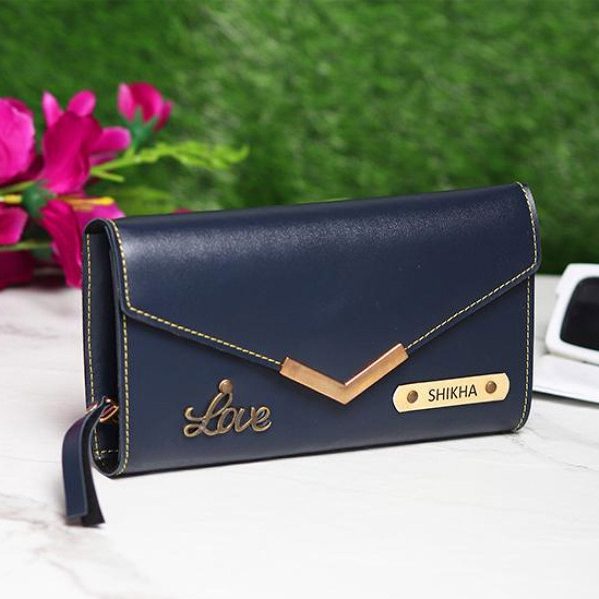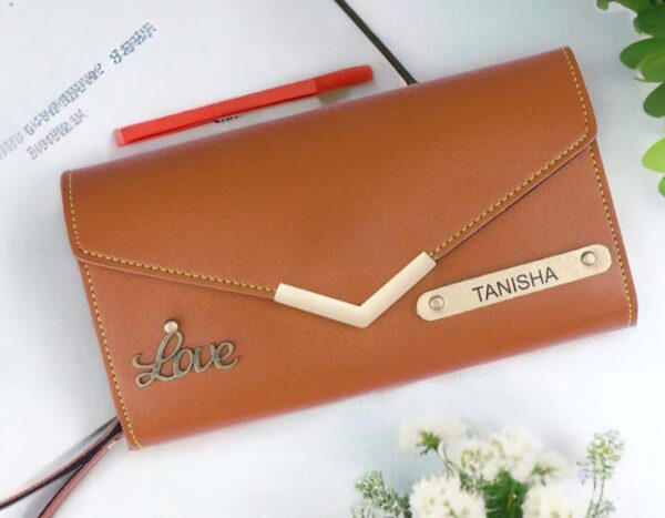 Stylish leather clutch featuring a personalized metal name plate and elegant “Love” charm. Designed to keep essentials organized while adding a classy, personal touch.