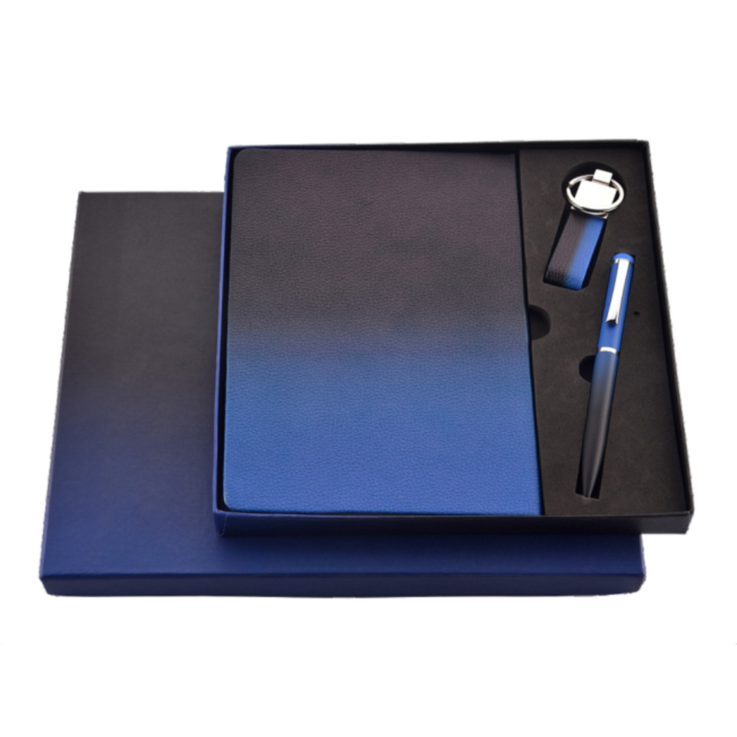 Impress clients, reward employees, or celebrate milestones with this elegantly crafted Premium Executive Gift Set. Featuring a sleek gradient blue theme, this set includes a high-quality notebook, a stylish ballpoint pen, and a leather keychain with a metal ring. Perfect for corporate gifting or personal use, this luxurious ensemble comes in a sophisticated black-and-blue box that exudes professionalism and class.
