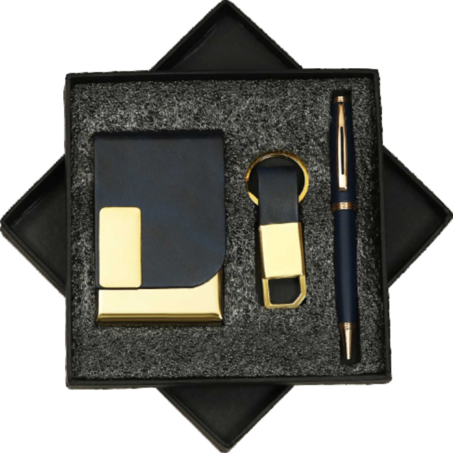 Unveil elegance and prestige with this Royal Blue & Gold Luxury Gift Set — a perfect blend of premium materials and classic design. Featuring a rich blue leatherette card holder, matching keychain, and a sophisticated pen with gold accents, this set is tailored for leaders, achievers, and esteemed clients. A refined gift solution for premium corporate occasions.